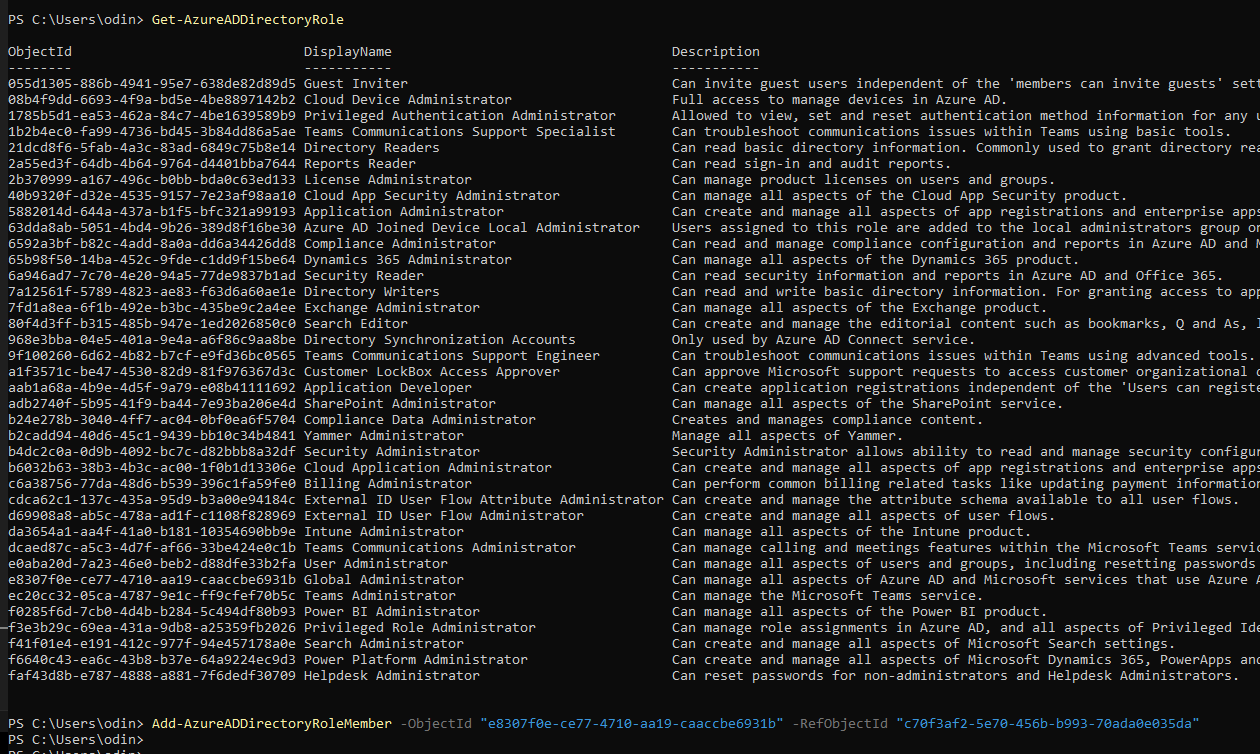 # connect to Azure AD with service principle password $password = ConvertTo-SecureString 'secret' -AsPlainText -Force $creds = New-Object System.Management.Automation.PSCredential('keyid', $password) Connect-AzAccount -ServicePrincipal -Credential $creds -Tenant TenantId Get-AzureADDirectoryRole Add-AzureADDirectoryRoleMember -ObjectId RoleObjectID -RefObjectId UserObjectId