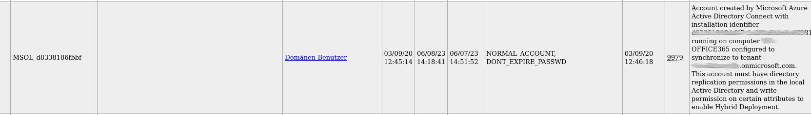 Ldapdomaindump was used to obtain a dump of all domain user accounts. The existence of the user account MSOL_* indicated that AzureAD connect was in use and user accounts and hashes were being synced with AzureAD. The description for this account in AD also tells us the hostname of the AD connect server and also helpfully explains that the MSOL account has directory replication permissions in the domain, in order to sync hashes to AzureAD. This means if you didn't have DA, compromising the Azure AD connect server would effectively grant you it, as you could use the MSOL account to perform a DCsync and grab the hash for any DA user.