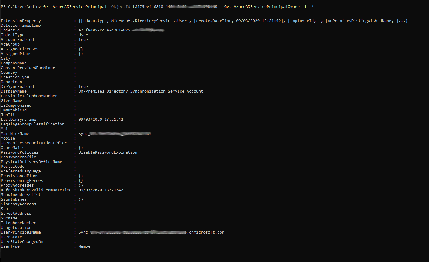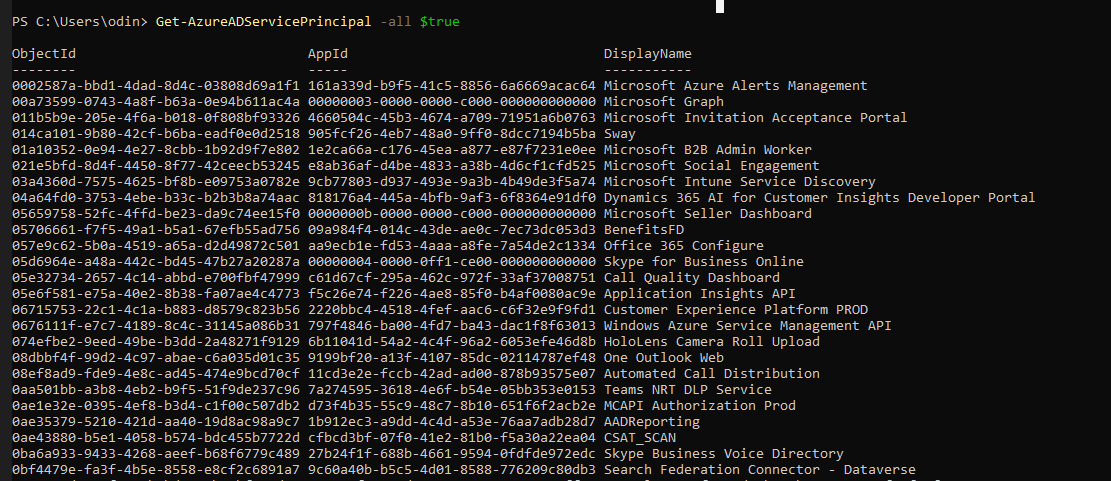 # Authenticate to the tenant $username = "username@domain.com" $password = 'YourVeryStrongPassword' $SecurePassword = ConvertTo-SecureString “$password” -AsPlainText -Force $Credential = New-Object System.Management.Automation.PSCredential($username, $SecurePassword) Connect-AzureAD -Credential $Credential $UserRoles = Get-AzureADDirectoryRole | ForEach-Object { $Role = $_ $RoleDisplayName = $_.DisplayName $RoleMembers = Get-AzureADDirectoryRoleMember -ObjectID $Role.ObjectID ForEach ($Member in $RoleMembers) { $RoleMembership = [PSCustomObject]@{ MemberName = $Member.DisplayName MemberID = $Member.ObjectID MemberOnPremID = $Member.OnPremisesSecurityIdentifier MemberUPN = $Member.UserPrincipalName MemberType = $Member.ObjectType RoleID = $Role.RoleTemplateId RoleDisplayName = $RoleDisplayName } $RoleMembership } } $UserRoles | ?{$_.MemberType -eq "ServicePrincipal"}